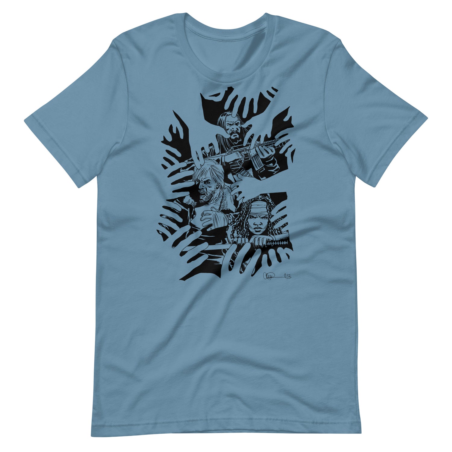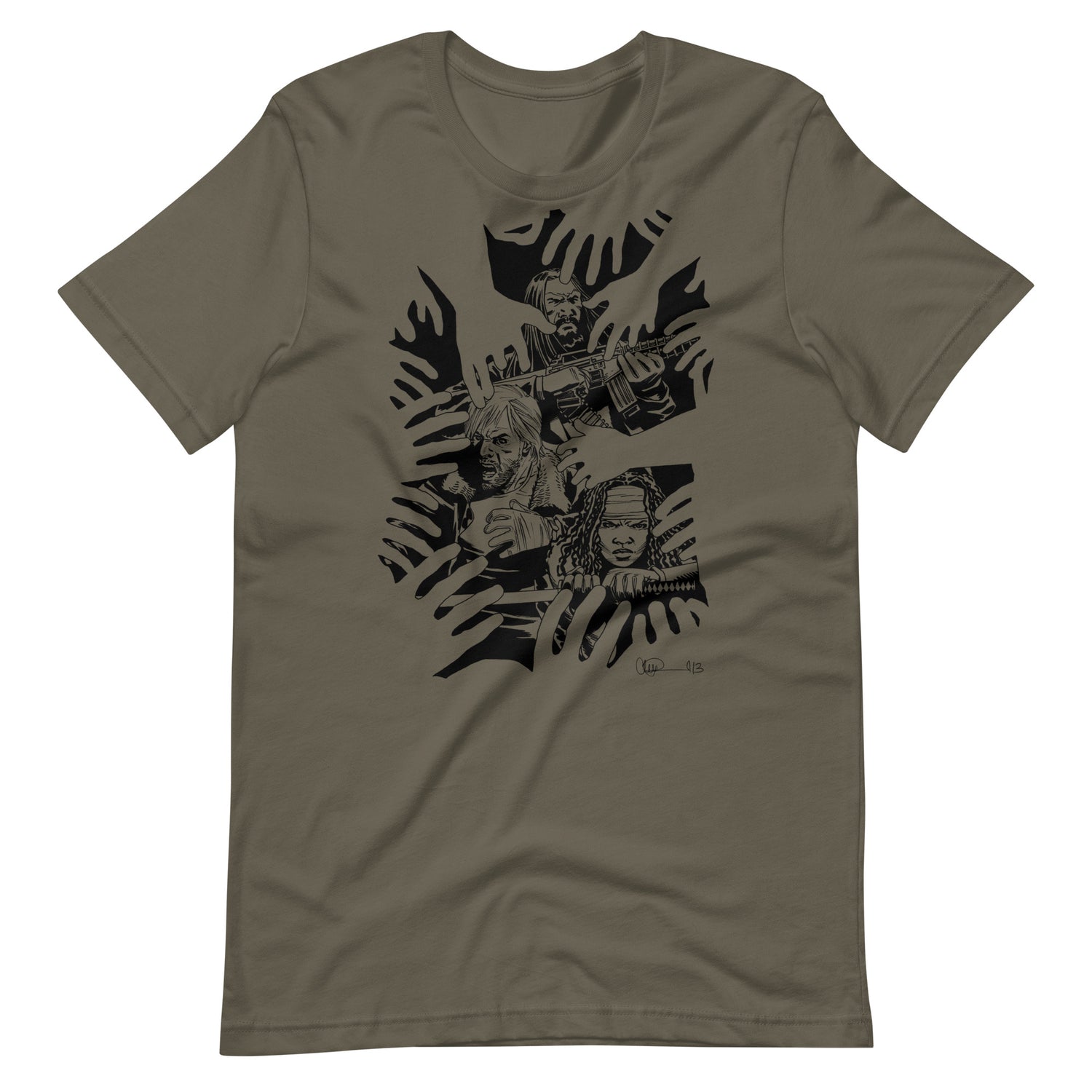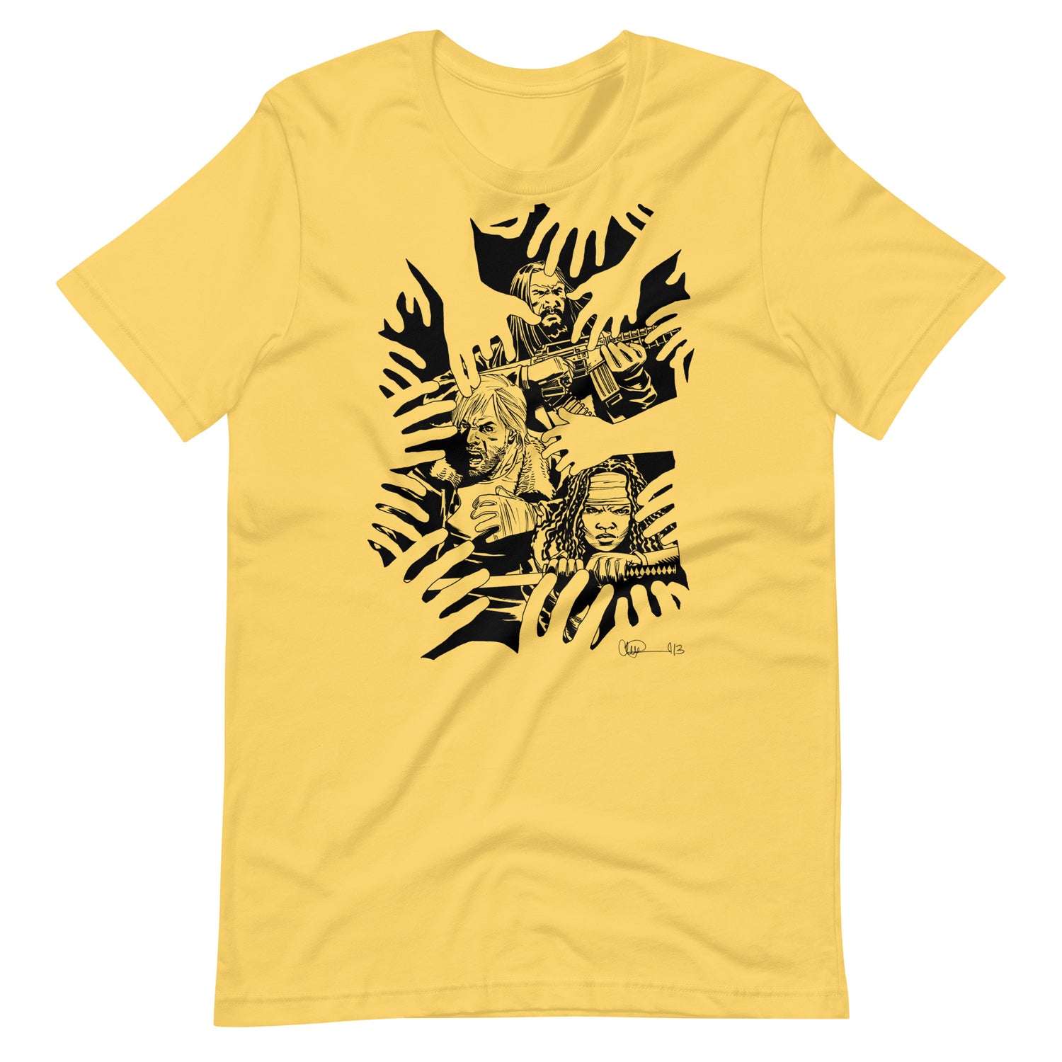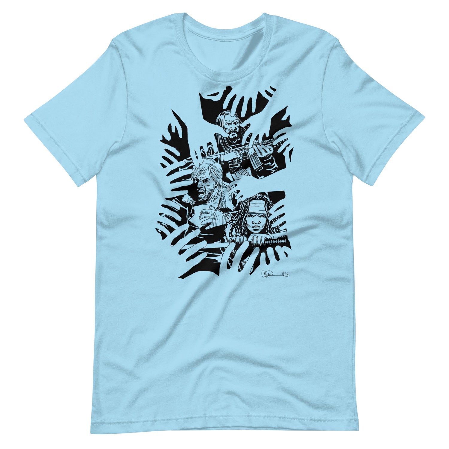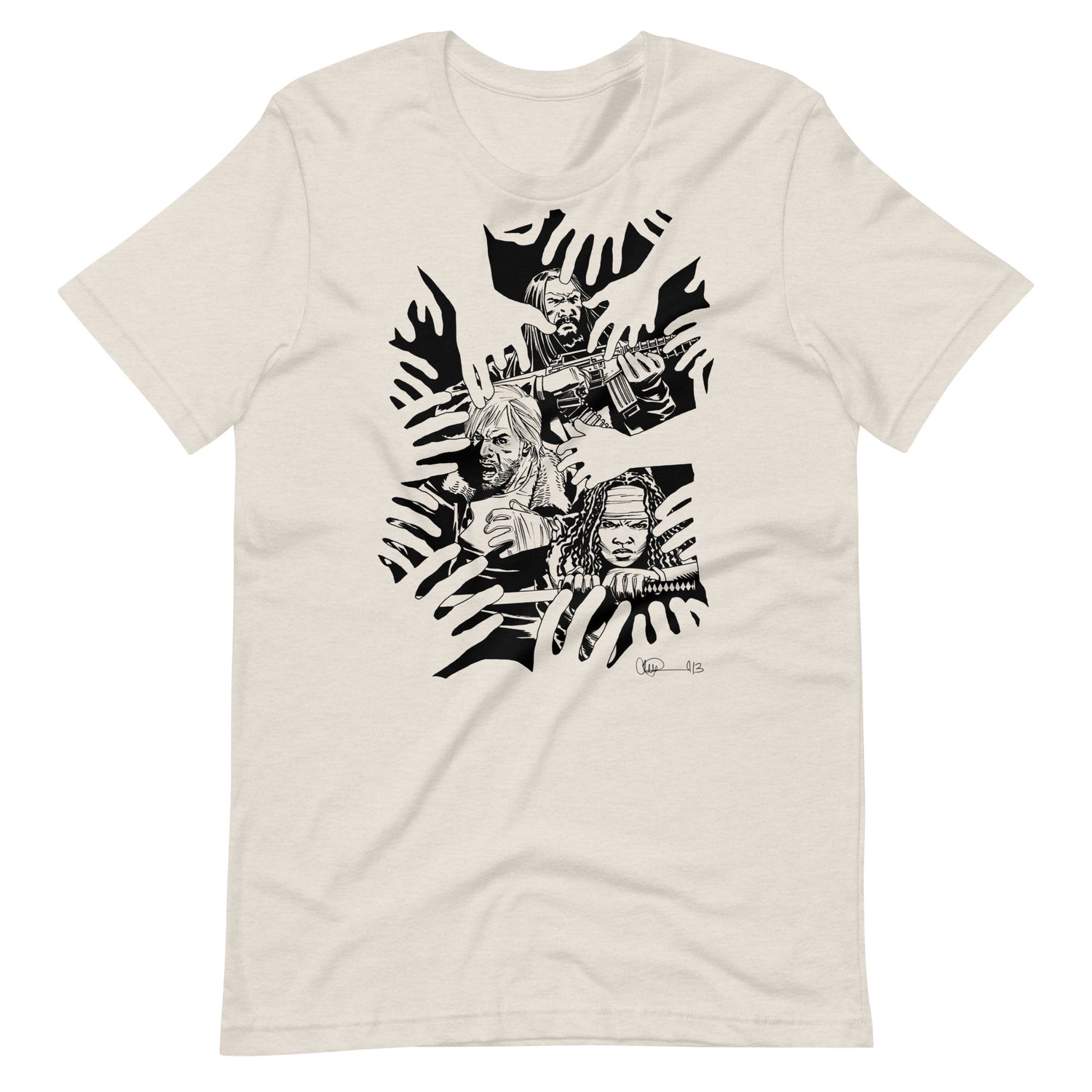 There is No Escape for the Survivors! Based on The Walking Dead #112 Image Expo variant cover, get this design with artwork by Charlie Adlard featuring Rick Grimes, Michonne, and Jesus surrounded by Walker hands.