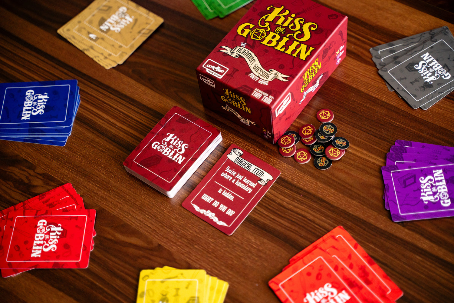 Kiss the Goblin is a party game where you describe how you would react to outrageous situations while trying to communicate a secret alignment. Utilizing the popular tabletop role playing alignment system, a player will try to share their secret alignment be it Chaotic Evil or Lawful Good when describing how they would react in both common and fantastical settings.